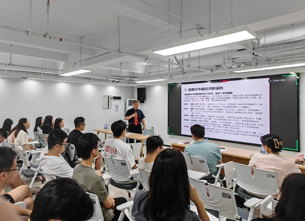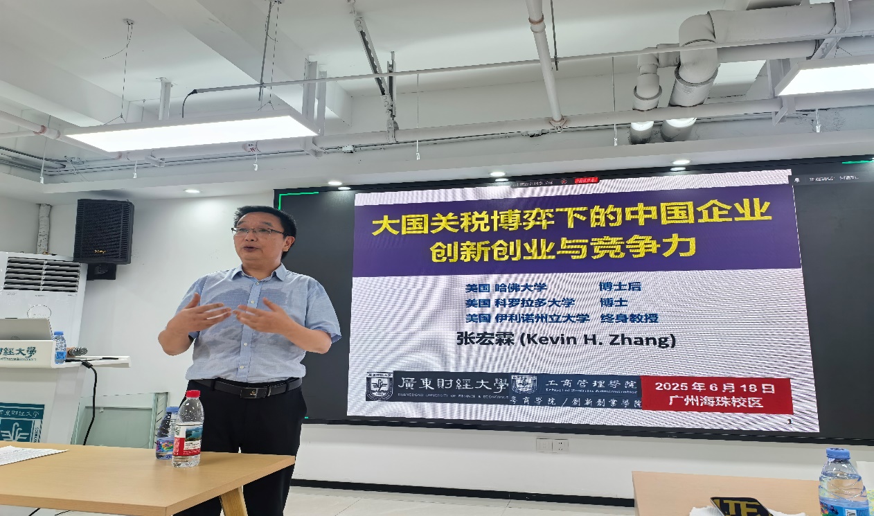 6月18日上午,美国伊利诺伊州立大学终身教授张宏霖应邀来我院交流访问,在广州校区研究生社区33栋(西塔)337为我院研究生作主题为“大国关税博弈下的中国企业创新创业与竞争力”学术讲座。张教授深入剖析了美国关税政策的根本理念及目标,强调特朗普政府贸易保护主义背后的制造业复兴与全球霸主地位维护意图,并指出这一政策反映了美国全球竞争力下滑的现实。讲座由学院副院长卢岳主持。